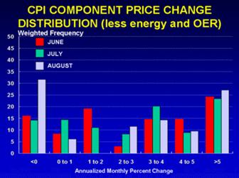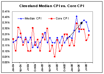 There are many ways to look at the inflation threat, we could look at the last two month's core CPI index, and see back to back 0.2% price increases and decide the risk is past us, or we could look at the (welcome) reduction on OER from a persistent 0.4% monthly growth rate to a 0.3% growth rate last month, and again take a deep breath. Perhaps the most exciting reason to believe the inflation threat is weakening is to look at the pullback in energy prices: nationwide gasoline prices have fallen from an average $3.08 a gallon on Aug 7th to just $2.44 as of September 25th. This may be the most encouraging development in the inflation outlook, but risks remain. For one the median level of price increases as reported by the Cleveland Fed is still well above the weighted average reported by the BLS, and as seen in the chart below, and until last month the steep trajectory suggested ongoing increases in core inflation.