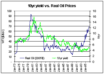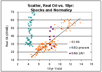 The chart above looks at the energy price/interest rate relationship on a month-end basis over time from 1983 to the present, where energy prices are seen in 2004 dollars. The purple diamonds are the energy shock associated with the first Gulf War, while the blue asterisks represent the current energy price shock, which started in roughly June 2002. When the markets are 'functioning normally' the relationship between energy and yields is generally strong and direct, but during times of rapidly accelerating energy prices, that relationship breaks down. If there were something fundamental about high energy prices leading to high inflation and by extension low bond prices, by now the market would have adjusted to the energy prices. That does not appear to have been the case.