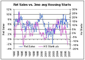 Unfortunately these questions are easier asked than answered. The chart below looks at the relationship between the headline retail sales number and housing starts. There definitely is a relationship, we can see the correlation between weaknesses in the late 1990s and perhaps even see a relationship between the slowdown in retail sales in 1994 and the housing market decline, but the strength of that relationship is not necessarily quantifiable. The housing market is clearly more volatile than the retail market, and there appear to be varying lags in the market's reaction to strength or weakness in the housing market. The chart below suggests we may start to see downward pressure on the consumer as a result of the housing market weakness, but this is not the driving factorsomething else is going on to support consumption.