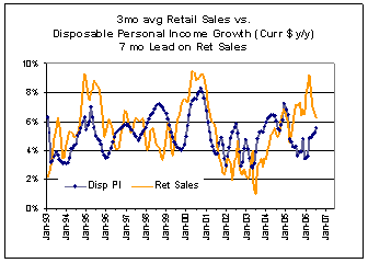 Although the relationship between retail sales and unemployment isn't strong, it is supported by a basic consumer logicthe more people who are working the more people feel free to shop. We can see this in the chart below, which looks at the relationship between disposable personal income and retail sales. Higher earnings lead to more disposable personal incomeanother index that relates closely to retail sales. Over the last twelve months, however the retail sales/disposable personal income relationship hasn't tracked well. But the current pullback in retail sales in conjunction with the sudden increase in personal income may lead to a re-coupling of these two numbers.
