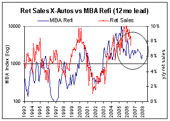 Going forward, MGR would certainly keep a close eye on the housing market, but we would keep a closer eye on the job market. For a homeowner that is not planning on moving, a job and their free cash are more important to their consumption patterns. Going forward the risk is an indirect one. The main risk to consumption is not straight from housing to the consumer, but from housing to construction and mortgage refinance layoffs and from there to consumption. This path is far more difficult to track in government data.