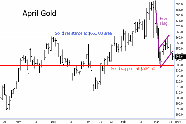 Tuesday's stock market turmoil has stymied the gold market bulls. Instead of a flight-to-quality scenario, whereby investors seek safe haven in gold, traders have instead dumped the precious yellow metal due to fears of deflationary pressures. During heightened geopolitical tensions in past months, gold prices had been pushed higher on a flight-to-quality scenario. Technical traders are also now eyeing on Wednesday morning a downside "breakout" from a bear flag pattern that has recently formed in April gold futures. A drop below strong chart support at the March low of $634.50 would help to confirm the downside breakout from the bear flag. Measuring implications from the flag pattern in April gold would suggest a downside target of below $600.00 an ounce. The gold market bears have indeed faded, from a technical perspective, the past few trading sessions. To regain the upside technical initiative, bulls would have to push April gold futures back above strong chart resistance at the $660.00 price area. A close above this resistance area would open the door to a price move to the late-February high of $692.50, or above. For May silver futures, prices on Wednesday have also seen a bearish downside "breakout" from a bearish pennant pattern on the daily bar chart. A push and close below strong technical support at the March low of $12.49 would produce more serious near-term chart damage to confirm the breakout from the bearish pennant pattern. Measuring implications for this particular bearish pennant on the daily chart in May silver suggest a downside target of below $11.00 an ounce. The silver bulls would regain some fresh upside technical momentum by pushing May futures back above solid technical resistance at last week's high of $13.235. Both silver bulls and bears will continue to monitor very closely what is now the most important "outside market" for these metals: the U.S. stock market. Further weakness in the stock market will very likely mean more downside price pressure in gold and silver.