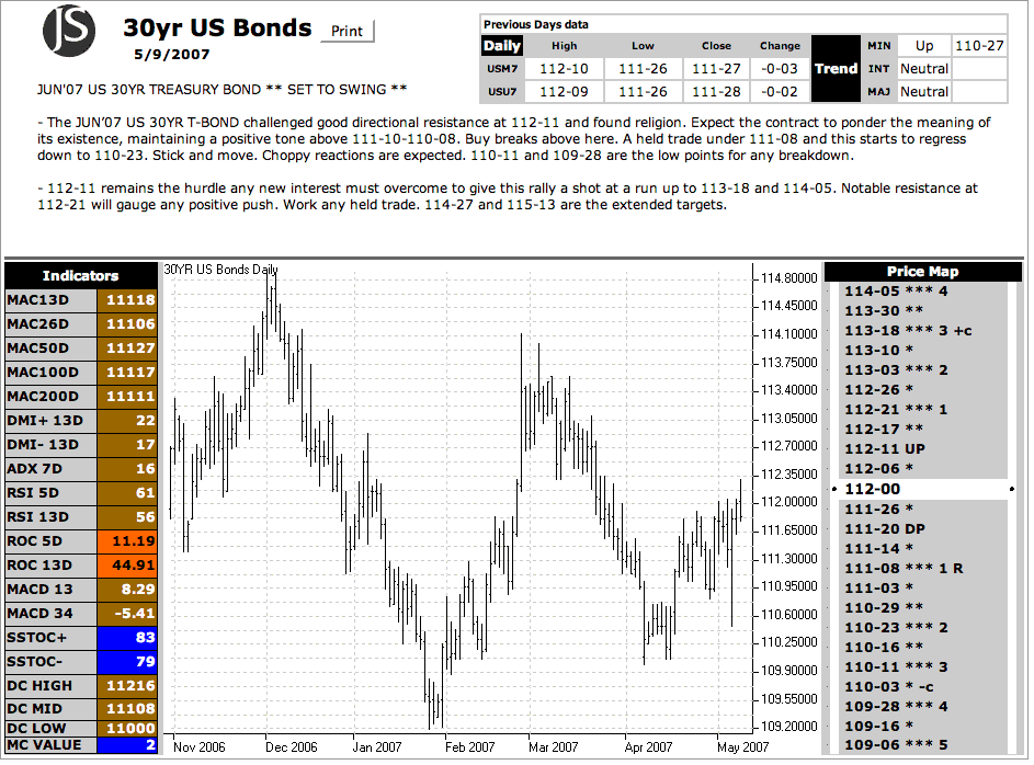 The JUN '07 US 30YR T-BOND challenged good directional resistance at 112-11 and found religion. Expect the contract to ponder the meaning of its existence, maintaining a positive tone above 111-10-110-08. Buy breaks above here. A held trade under 111-08 and this starts to regress down to 110-23. Stick and move. Choppy reactions are expected. 110-11 and 109-28 are the low points for any breakdown.