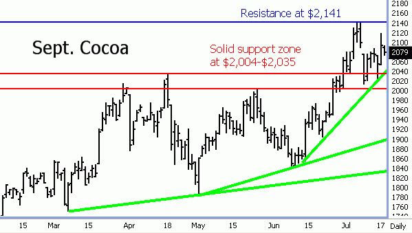 Cocoa futures on the New York Board of Trade are in a strong price uptrend, as seen on the daily bar chart. There are no early technical clues of a market top being close at hand as the bulls have the solid near-term technical advantage. The bears would regain some fresh downside near-term technical momentum if they could push and close September cocoa futures below a strong support zone located at $2,035 to $2,004. The bulls would gain additional upside power by pushing September futures above strong chart resistance at the contract high of $2,141. Stay tuned!