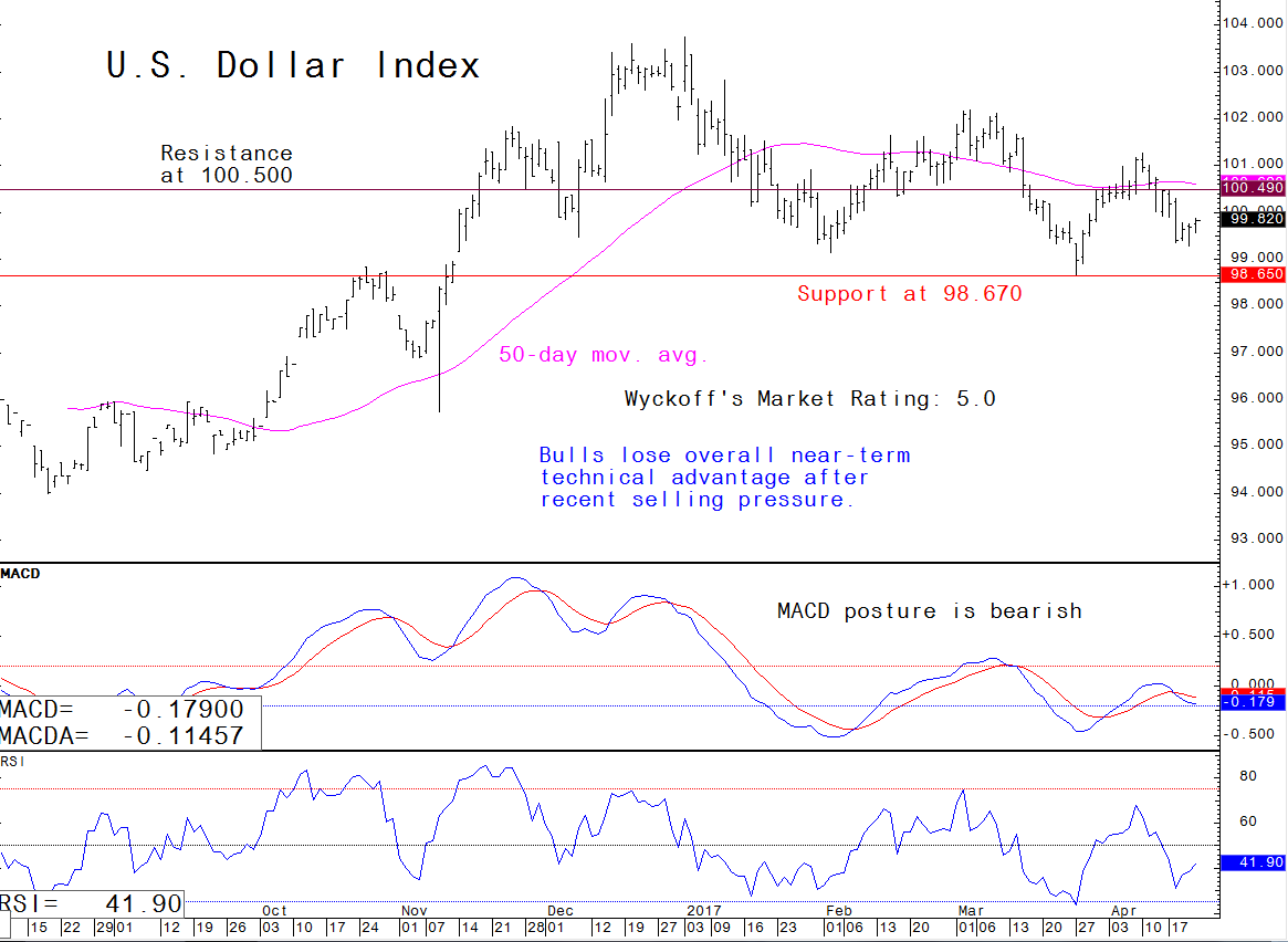 The U.S. dollar index is a basket of six major world currencies stacked up against the greenback. See on the daily bar chart for the USDX that prices have been trending lower from the January high.
