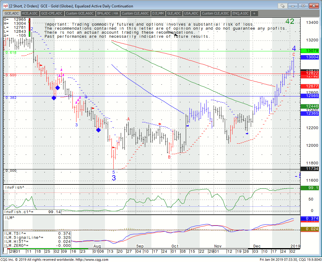 Daily chart from this morning, (Jan. 4th 2019).Notice the market touched the psycholigical $1300 mark overnight before backing off about $20. On the chart you can see we got a slanted blue arrow in the begining of Dec. This is a tool/ ALGO I use that tries to predict begining of trends.