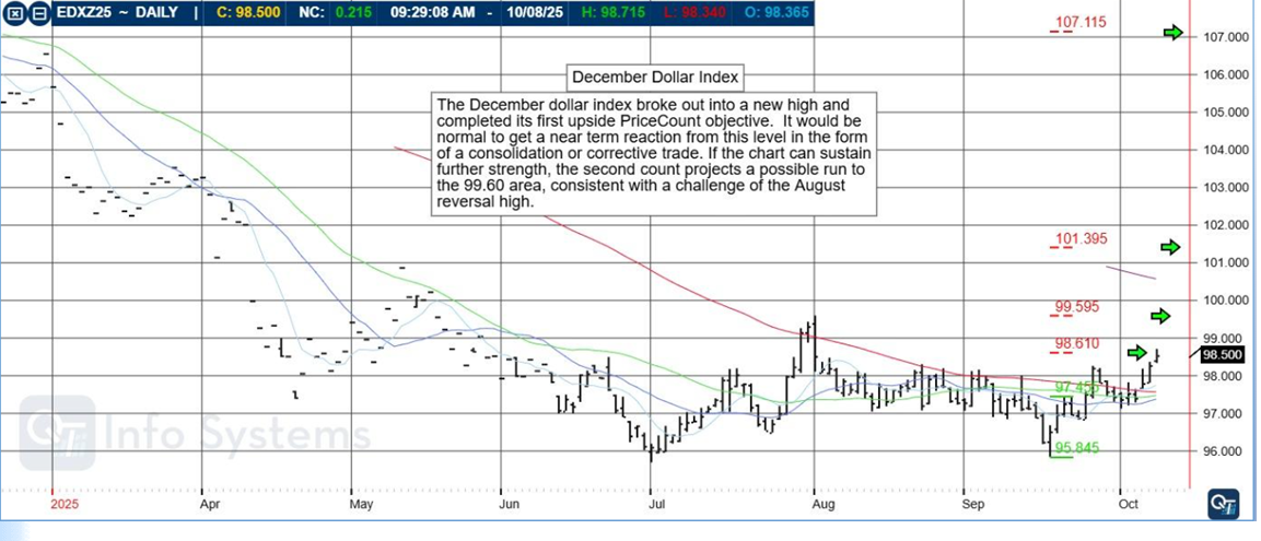 The December dollar index broke out into a new high and completed its first upside PriceCount objective. It would be normal to get a near term reaction from this level in the form of a consolidation or corrective trade. If the chart can sustain further strength, the second count projects a possible run to the 99.60 area, consistent with a challenge of the August reversal high.